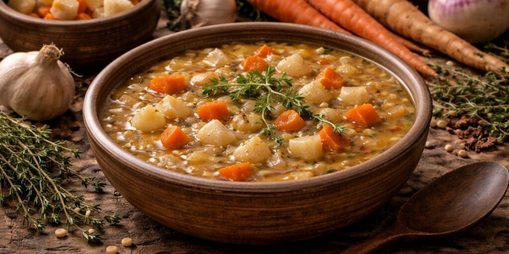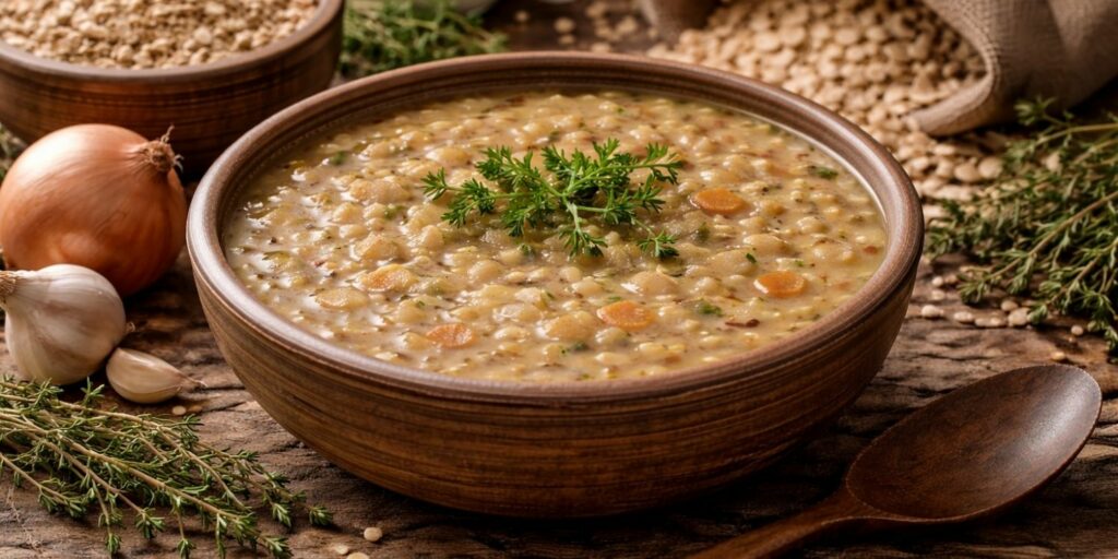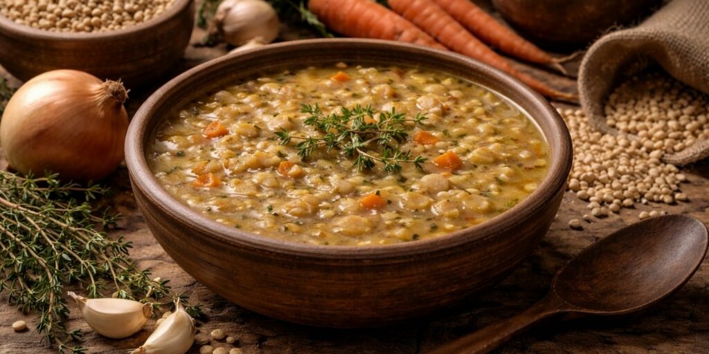 Les grains d’orge étaient longuement cuits dans de l’eau ou un bouillon léger. Cette cuisson libérait l’amidon et épaississait naturellement la soupe. On pouvait y ajouter quelques légumes selon la saison. Le résultat était à la fois simple et rassasiant.