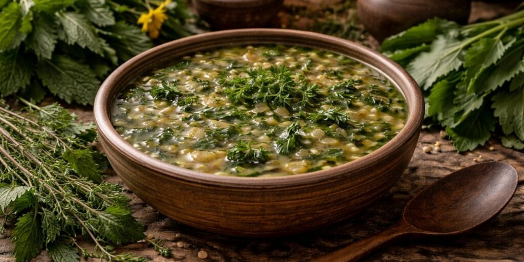 Le potage aux herbes sauvages reflète la connaissance fine de la nature au Moyen Âge. Les populations savaient reconnaître les plantes comestibles. Orties, oseille ou pissenlits entraient dans la composition des soupes. Ces herbes apportaient fraîcheur et nutriments.