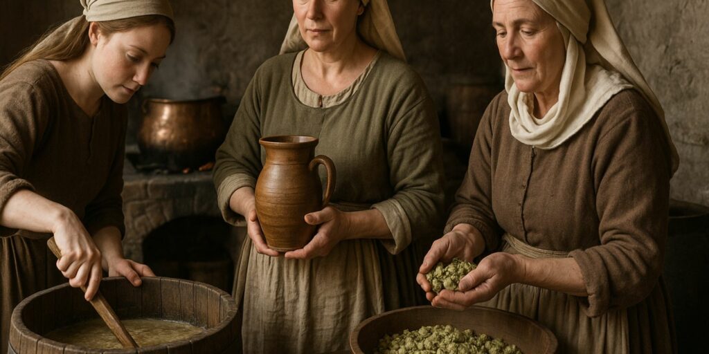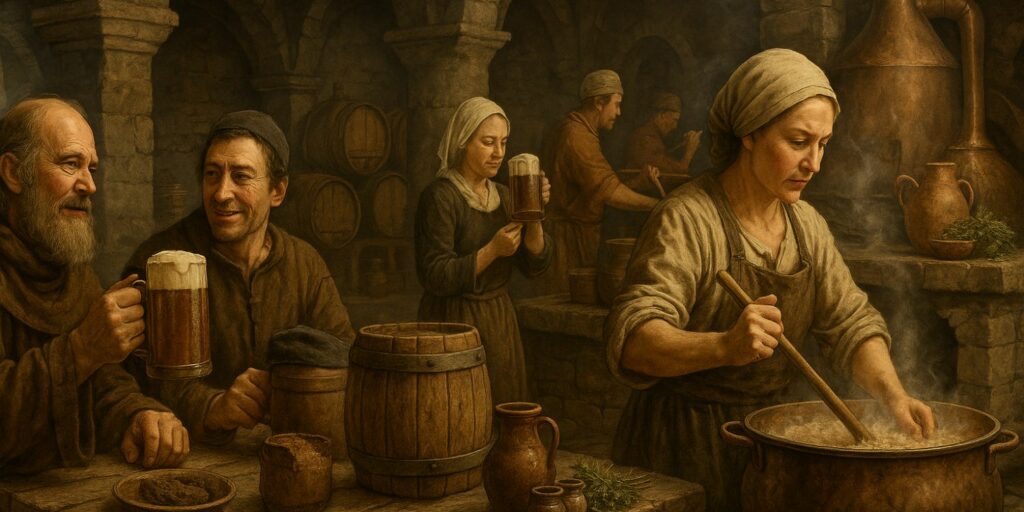 Au Moyen Âge, la fabrication de la bière était une activité domestique principalement assurée par les femmes. Dans la majorité des foyers, ce sont elles qui brassaient la bière pour la consommation familiale, en utilisant des méthodes transmises de génération en génération. Ce savoir-faire était une compétence précieuse dans la gestion du ménage. On parlait même de certaines femmes comme des « alewives », expertes reconnues dans leur communauté.