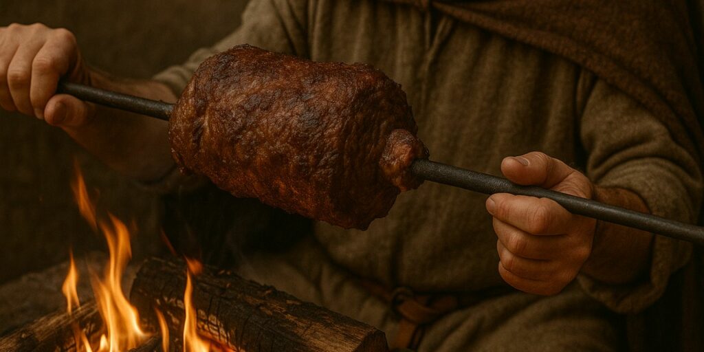 La dureté de la viande de bœuf était bien connue des cuisiniers médiévaux. Provenant d’animaux âgés et musclés, elle exigeait des heures de cuisson pour devenir tendre. On la faisait souvent mijoter à feu doux, dans des chaudrons remplis d’eau ou de vin, afin d’en extraire le maximum de saveur et de rendre les fibres plus souples.