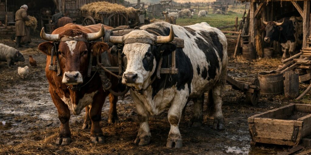 Les bœufs étaient dressés dès leur jeune âge à la traction et gardaient ce rôle durant de nombreuses années. Leur lenteur, compensée par leur endurance, convenait parfaitement à l’agriculture médiévale, encore rudimentaire. Les labours nécessitaient de longues heures de travail, et seul un bœuf pouvait supporter cet effort régulier sans s’épuiser.
