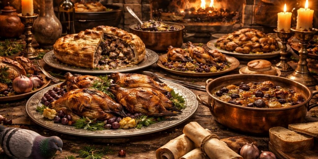 Le pigeon rôti était un plat courant lors des festins. Il était souvent présenté entier, doré et croustillant. Les cuisiniers maîtrisaient l’art de la cuisson à la broche. Ce mode de préparation mettait en valeur la qualité de la viande.