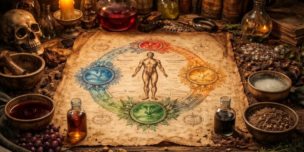La théorie repose sur l’existence de quatre liquides fondamentaux dans le corps humain. Il s’agit du sang, de la bile jaune, de la bile noire et du flegme. Chacun de ces liquides est associé à un élément naturel : l’air, le feu, la terre et l’eau. Cette correspondance reflète la vision symbolique du monde médiéval. Le corps humain est perçu comme un miroir de l’univers.