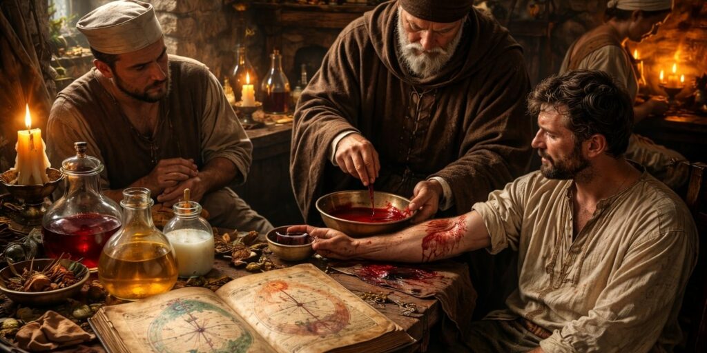 Au Moyen Âge, les savants redécouvrent ces textes grâce aux traductions arabes et latines. La théorie des humeurs s’impose alors comme une vérité scientifique. Elle structure l’enseignement universitaire et guide les pratiques des médecins. On ne remet presque jamais en question ses principes. Elle devient le socle de la médecine médiévale.