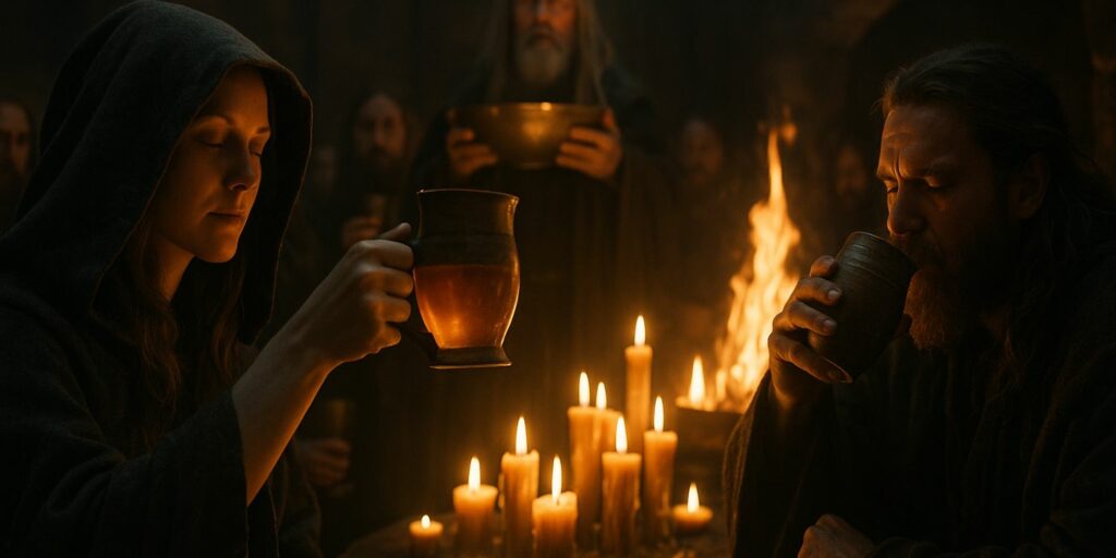 Dans l’imaginaire du Moyen Âge, l’hydromel n’était pas qu’une boisson : il était porteur de symboles et de légendes. On lui attribuait des pouvoirs particuliers, parfois même divins. De nombreuses mythologies évoquent un “nectar des dieux”, souvent assimilé à des formes d’hydromel. Ces récits renforçaient l’idée que ce breuvage avait une dimension sacrée. Sa consommation lors de rituels n’avait donc rien d’anodin, elle participait au lien entre le monde terrestre et le monde spirituel.