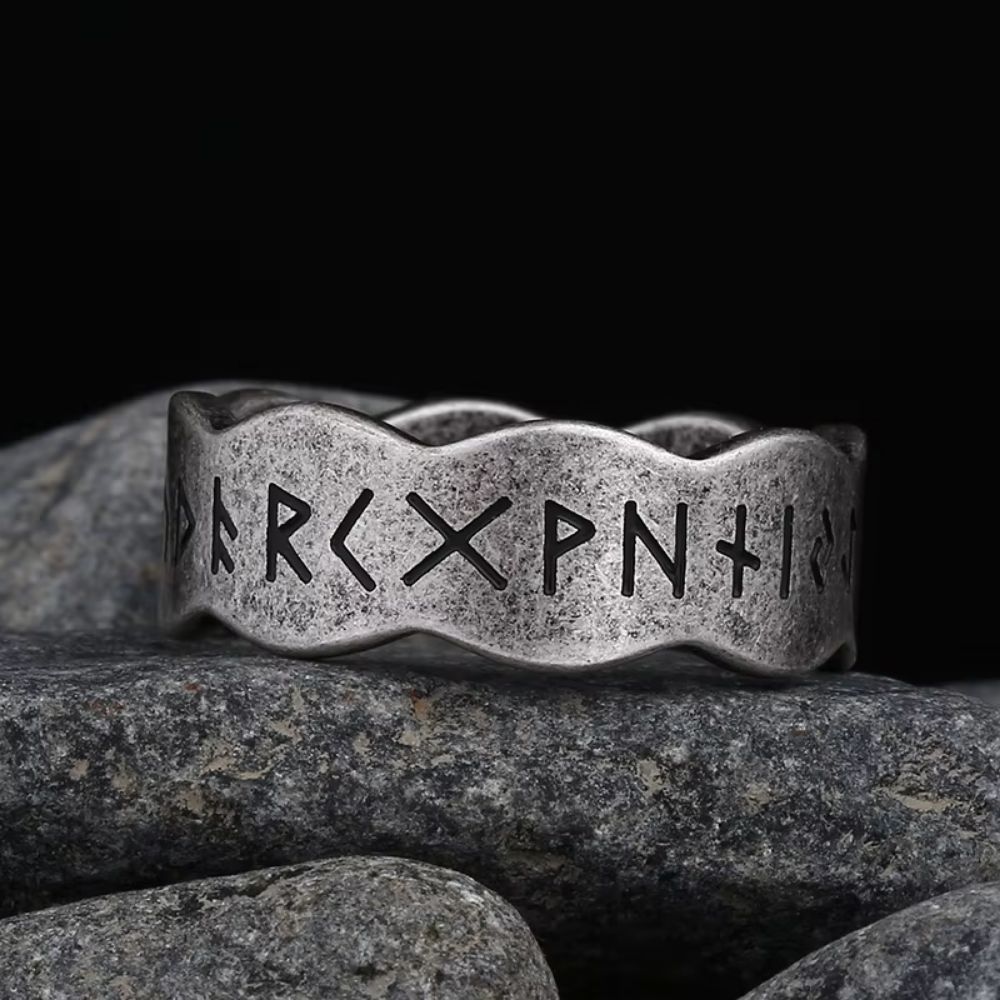 La première chose qui frappe avec cette bague, c’est sa forme ondulée. Contrairement aux anneaux classiques, elle semble vivante, comme si elle avait été forgée par les éléments eux-mêmes. Les runes, gravées dans la matière, s’intègrent parfaitement à cette structure organique, donnant l’impression d’un artefact sacré.