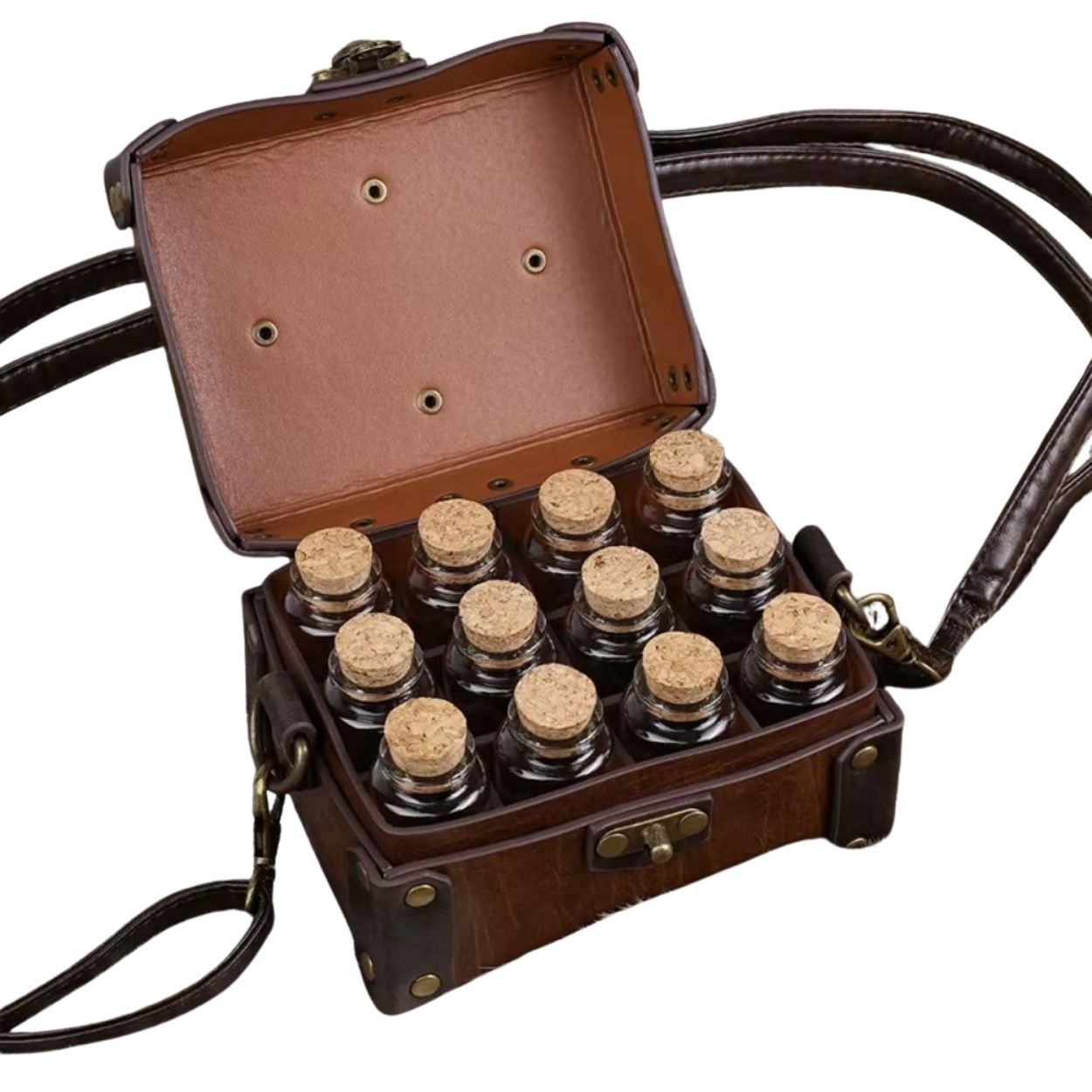 Chaque fiole repose dans son propre compartiment, assurant une excellente stabilité même en mouvement. Le cuir brun lui donne un aspect vieilli et réaliste, parfait pour un univers rustique ou naturel. Solide, pratique et immersif, ce coffret se fond parfaitement dans un environnement de GN ou de reconstitution historique.