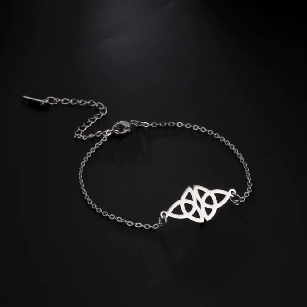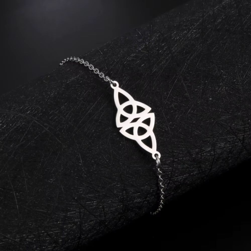 Le triquetra, figure emblématique des traditions celtiques, symbolise l’unité et la continuité. Ici, il est présenté dans une version légère, suspendue à une fine chaîne argentée qui épouse subtilement la forme du poignet. Sa finition brillante lui confère un éclat discret et raffiné.