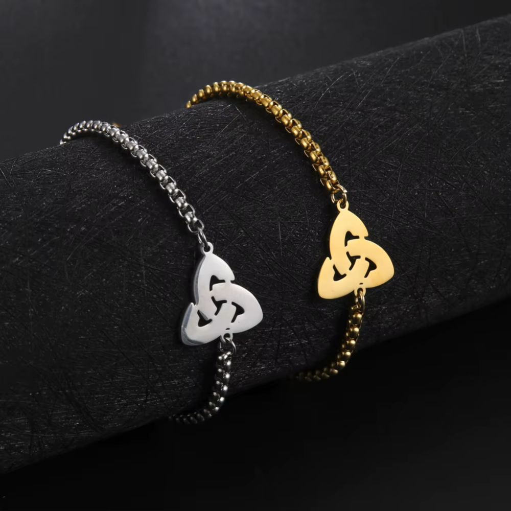 Ajoutez une touche de force et de mysticisme à votre poignet avec ce bracelet triquetra stylisé monté sur une chaîne épaisse. Disponible en version dorée ou argentée, ce bijou affirme votre style tout en rendant hommage à un symbole celte puissant.