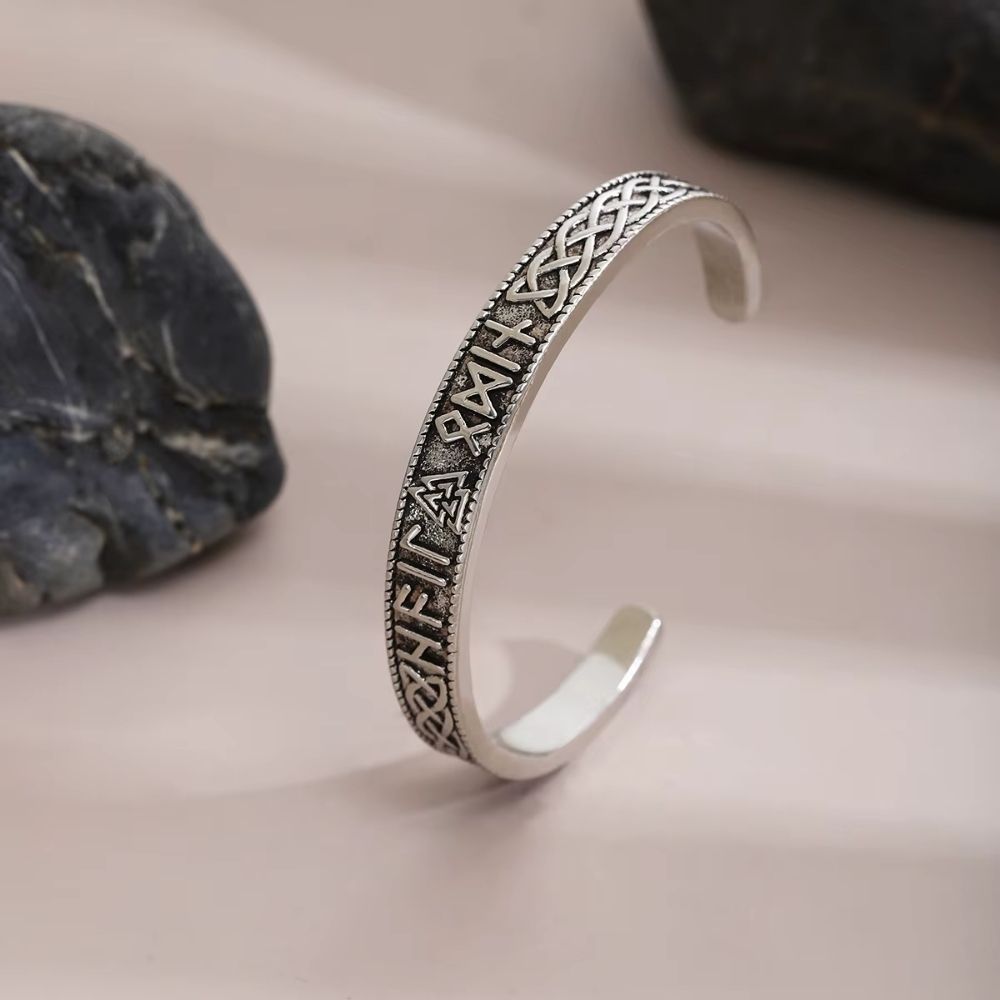 Avec ses finitions travaillées et ses inscriptions puissantes, ce bracelet s’adresse à ceux qui veulent affirmer leur lien avec les traditions nordiques.