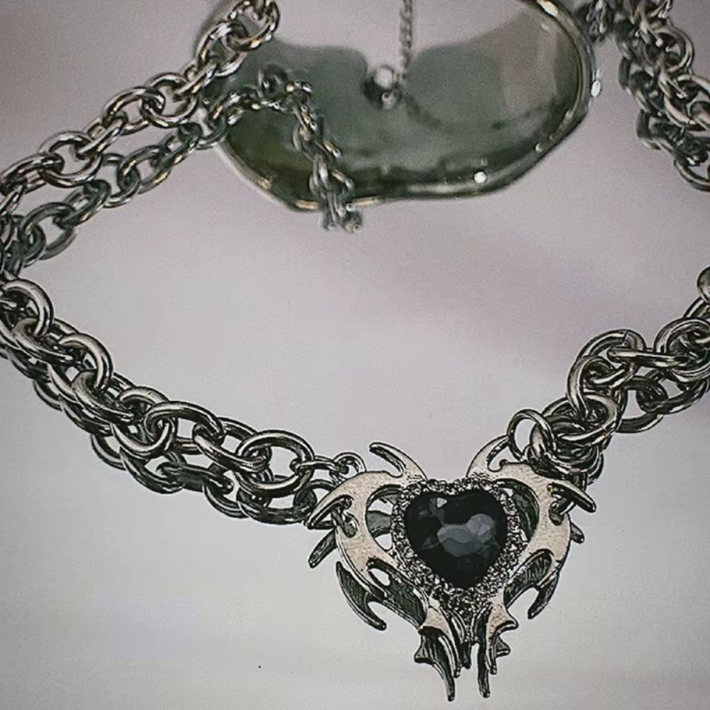 Puissant, sculptural et rebelle, ce collier à double chaîne affirme son style dès le premier regard. En son centre, un cœur noir facetté, cerné de griffes métalliques flamboyantes, semble battre d’une énergie indomptable. Une pièce brute et magnétique, à porter comme un manifeste.