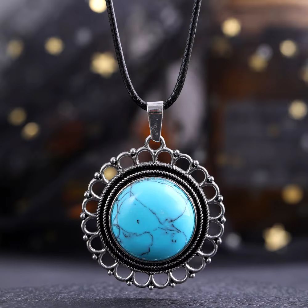 Succombez au charme mystique de ce collier médaillon orné d’une pierre turquoise, véritable hommage aux bijoux anciens à l’esthétique médiévale. Chaque détail de ce pendentif évoque les talismans d’autrefois, portés par les voyageurs, les érudits ou encore les protecteurs du royaume. Le médaillon, monté sur une corde noire discrète, abrite en son centre une pierre turquoise à la couleur céleste, striée de veines sombres comme les lignes du destin.