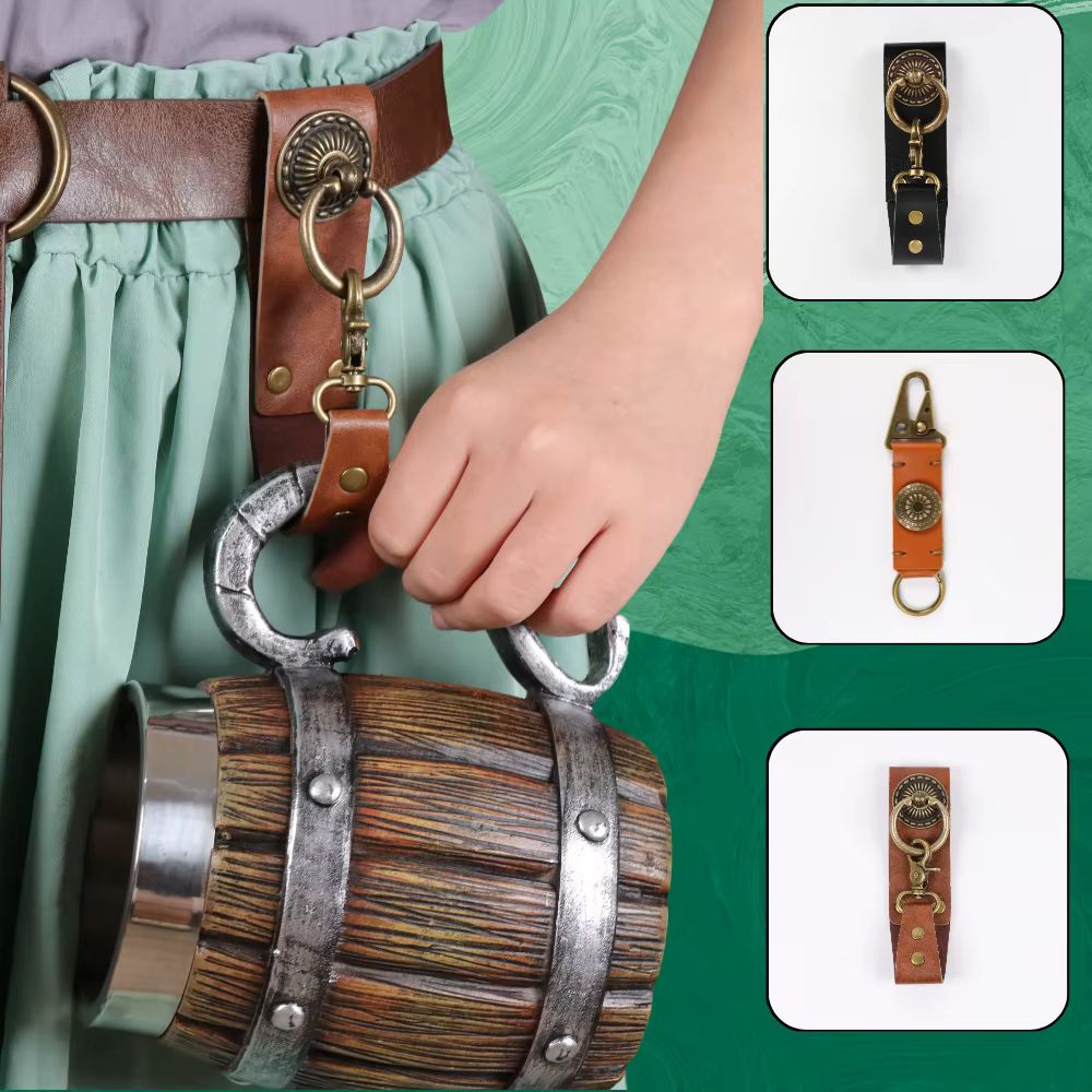 Le cuir épais et la boucle en métal vieilli évoquent les ceintures d’équipement des soldats, chasseurs ou bardes du passé. Son aspect patiné et ses rivets renforcés témoignent d’un esprit aventurier et utilitaire. Il s’accroche fermement à la ceinture et supporte sans difficulté le poids des chopes les plus imposantes.