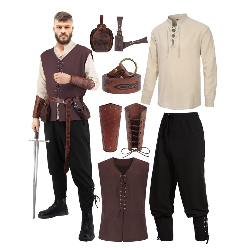 - Accessoires inclus : gilet marron, brassards, ceinture, gourde décorée