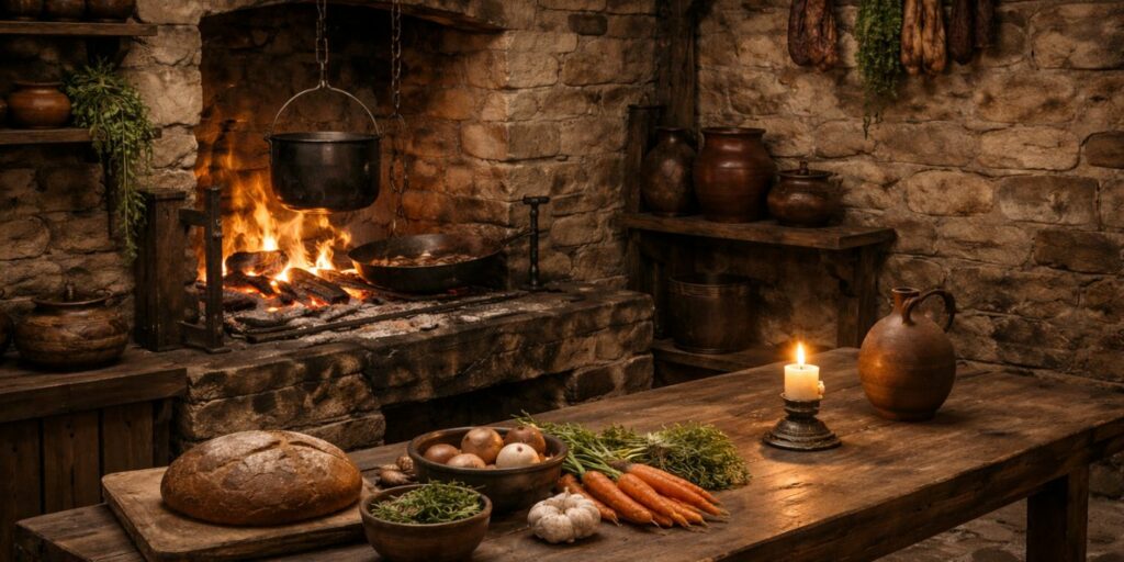 Ainsi, la cuisine médiévale ressemblait davantage à un atelier organisé qu’à une simple pièce domestique.
